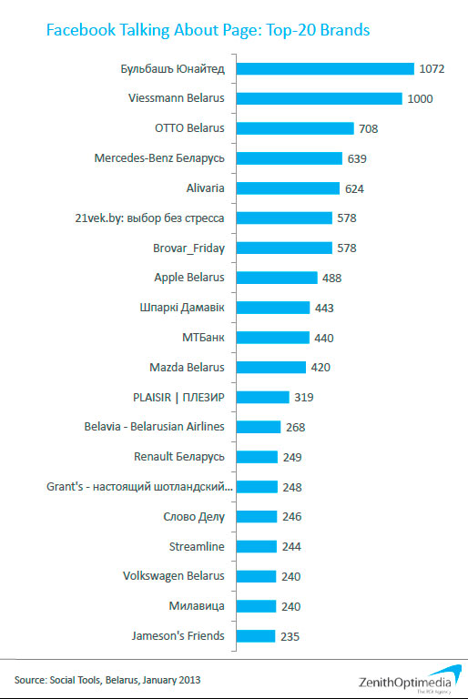 По сравнению с декабрем 2012 года топ-20 брендов по количеству подписчиков несколько видоизменился. Если в декабре его возглавляла страничка «Mercedes-Benz Беларусь», то в январе лидировала страница «OTTO Belarus». Значительно поднялась страница «Viessmann Belarus» - с пятого на третье место. Однако по количеству активных подписчиков перечисленные во многом уступают странице «Бульбашь Юнайтед», у которой абсолютное большинство подписчиков - активное.