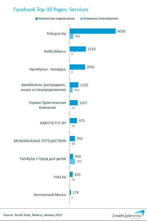 Также ZenithOptimedia Belarus проанализировал страницы в Facebook различных белорусских сервисов. В этом рейтинге лидировало сообщество «Pokupon.by». С большим отрывом на втором месте оказалась страница «Kvitki Belarus», на третьем - «КупиКупон –Беларусь».