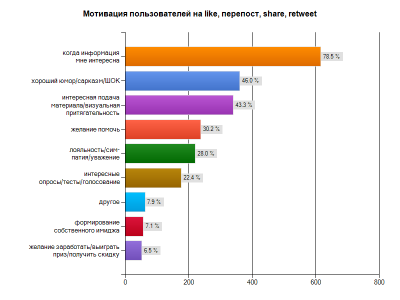 Изрядные сомнения у исследователей вызывают и маркетинговые схемы, в основе которых лежит оставленный «лайк» или перепост. Только 6% респондентов готовы поделиться с друзьями или «ретвитнуть» информацию, если лично им она не интересна (например, для победы в каком-либо конкурсе).