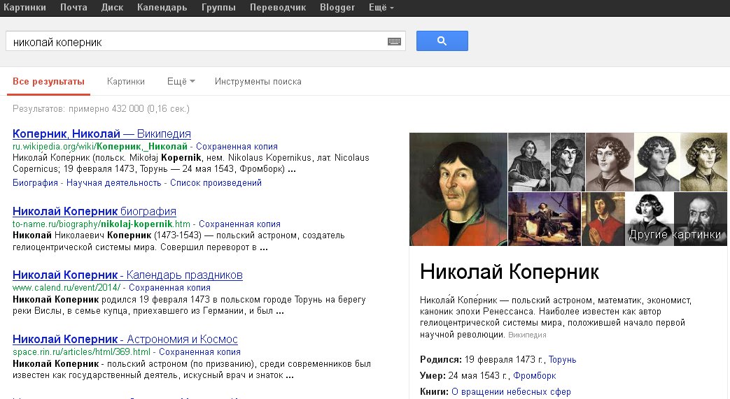 Напомним, благодаря «Графу знаний» Google отображает в выдаче не только обычные ссылки, но и прямые ответы на вопросы пользователей. Например, так сейчас стала выглядеть выдача по запросу [николай коперник]: